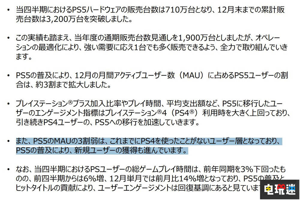 索尼在演示文件中表示,近30%的PS5月活跃用户是从来没有使用过PS4主机的。也就是说,随着PS5的逐渐普及,新的用户群体正在进一步发展。不过索尼的PSN月活跃用户是以每个月在PSN上游玩游戏或者使用相关服务的单一账号计算。所以在索尼统计的30%,近3360万的PSN“纯PS5”月活用户数也并非代表着单一玩家,因为很多玩家可能由于各种原因在多个地区注册PSN账户。