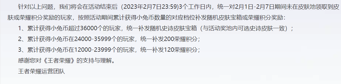 还好官方也及时给出了处理结果,这个结果还是让玩家们挺满意的,统一对2月1日-2月7日期间未在皮肤池领取到皮肤或荣耀积分奖励的玩家,按照活动期间累计获得小兔币数量的对应档位补发随机皮肤宝箱或荣耀积分奖励: