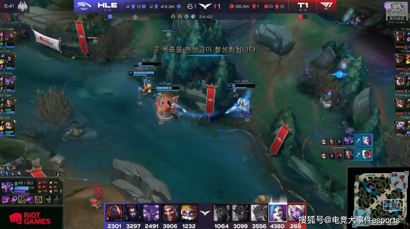 其实跟HLE的第一局比赛,T1选出的阵容就非常的极端,炸弹人+烬走下路,究极后期的卡萨丁,一碰就碎的杰斯,所以这对于oner的前期节奏要求非常高,好在T1做得还不错,当然HLE在中期那波冒险开大龙也是给足了机会,可T1即便有了几次大龙buff的加持,甚至拿到了龙魂,但好几波团战你会发现,这套阵容只要被冲脸就必输,手握一万经济的领先,但就感觉他们的阵容非常不好赢。