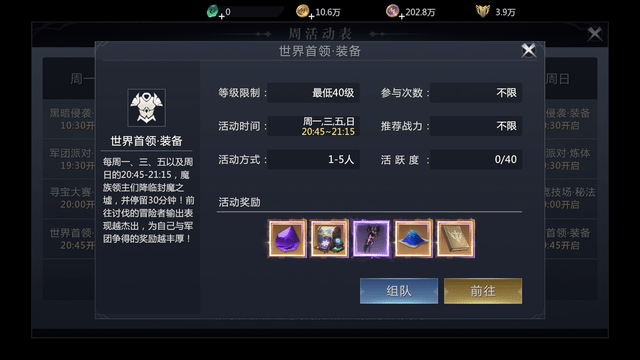 《魔域手游2》其实非常贴心,不仅把各种活动都整合在了“活动”中,每一个活动都有对应的“前往”按钮,方便小伙伴们自动寻路前往对应的地点开启任务,组队还是单人,亦或者是军团,都会清楚地标明。奖励次数、条件限制、开启时间,甚至周活动表,都会在“活动”中清楚展示,小伙伴们点击相关活动还能看到这些活动对应的奖励是什么,大大方便了小伙伴们进行任务选择。(搬砖党们也不用辛辛苦苦自己记录活动时间和奖励了!)