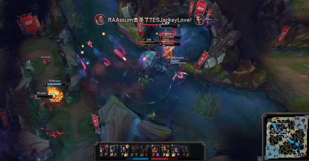 事实也和Doinb与微笑预测的那般,RA中上野前期没有声音,反倒是TES上单晴天操作诺手在上路面对RA上中野三人的Gank,完成1v3的逆天三连杀。