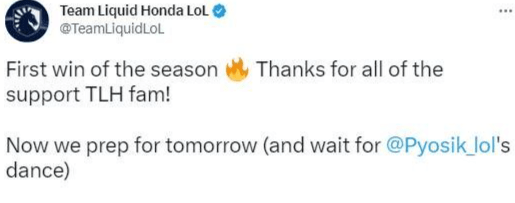 赛后,TL官推发文表达喜悦:“本赛季的第一场胜利,感谢TL粉丝们的支持,现在我们为明天比赛做准备(期待Pyosik的舞蹈)。”