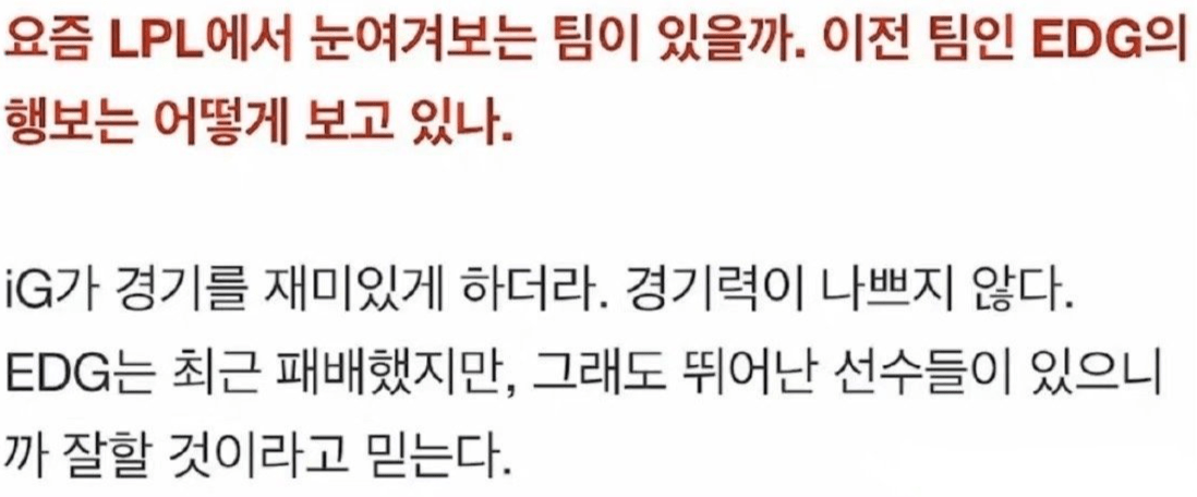 昨天LCK春季赛,HLE以下克上击败积分第一的T1,终结连败。赛后,韩媒记者询问Viper是否有关注LPL的比赛,如何看待之前队伍EDG的状态?