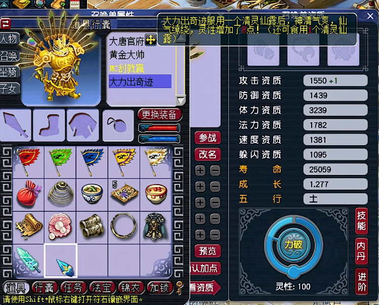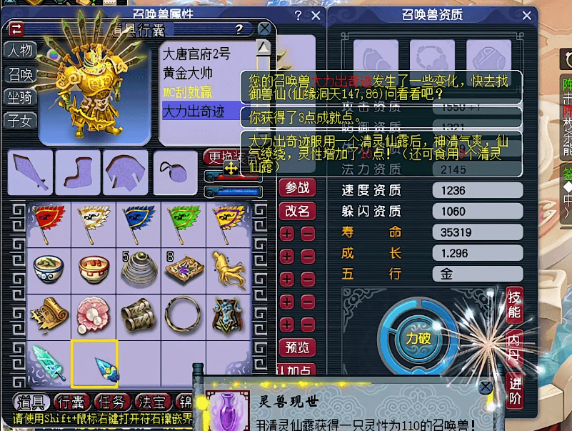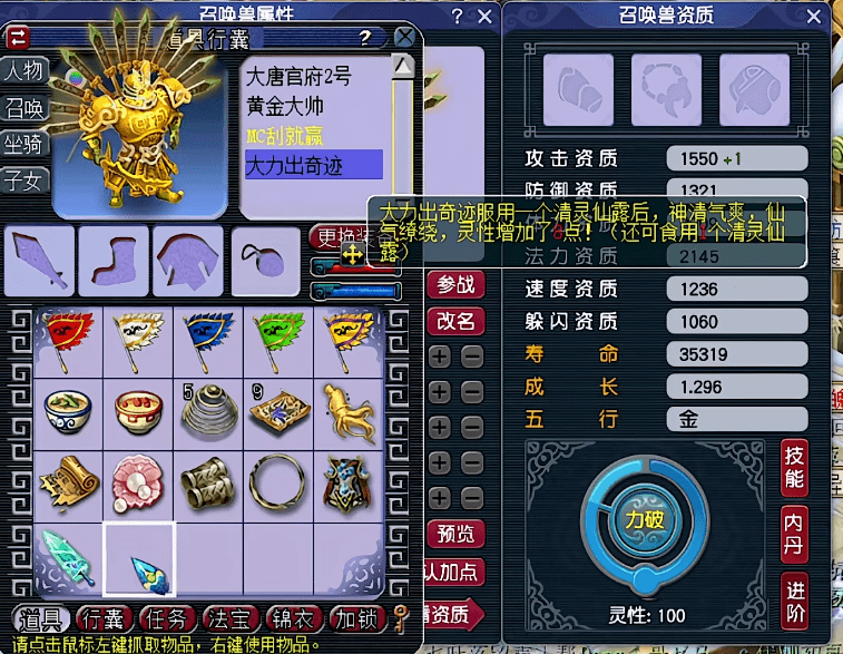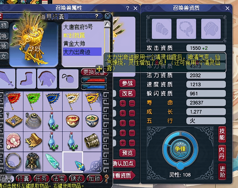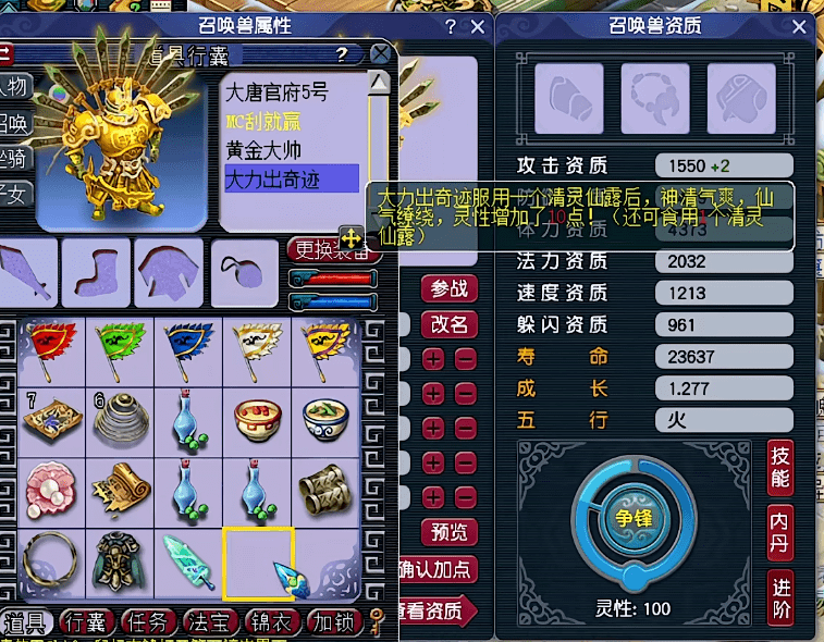 第1只,很顺利的就将灵性吃到了100!玩家考虑了一下,决定将第2只、第3只的灵性都吃到100之后,再一起吃第7个清灵仙露。要知道,对于想要进阶110灵性的召唤兽来说,第7个清灵仙露必是高8。吃高8的时候,可获得8点、9点、10点灵性。3只一起吃的话,总有一只可以进阶110灵性成功。不得不说,玩家非常机智。