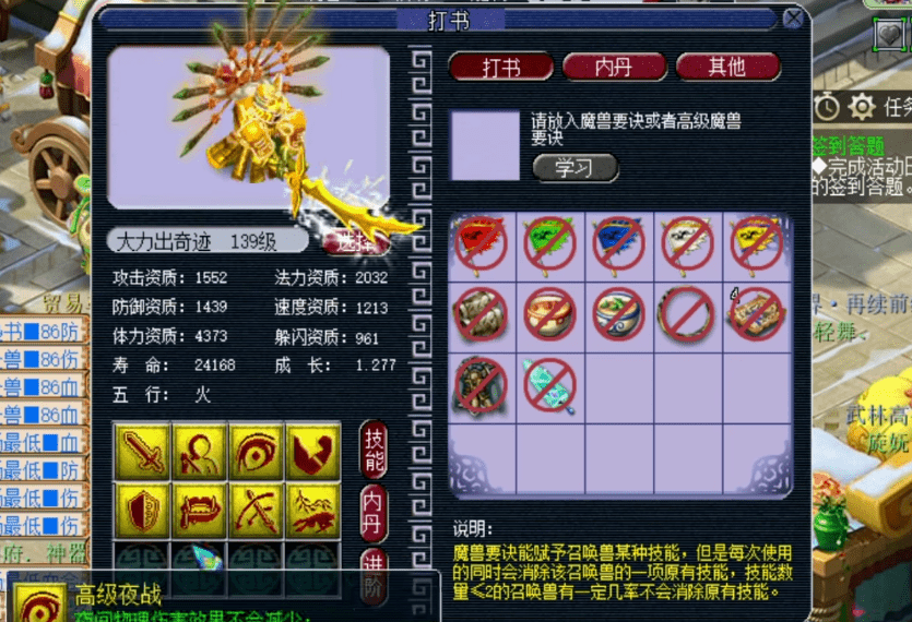 对于这样没有特殊技能的全红召唤兽来说,打书没有任何技巧可言,打掉什么技能直接补就可以了。话虽如此,一旦循环起来的话,接连补打个10几本高级魔兽要诀也是有可能的。