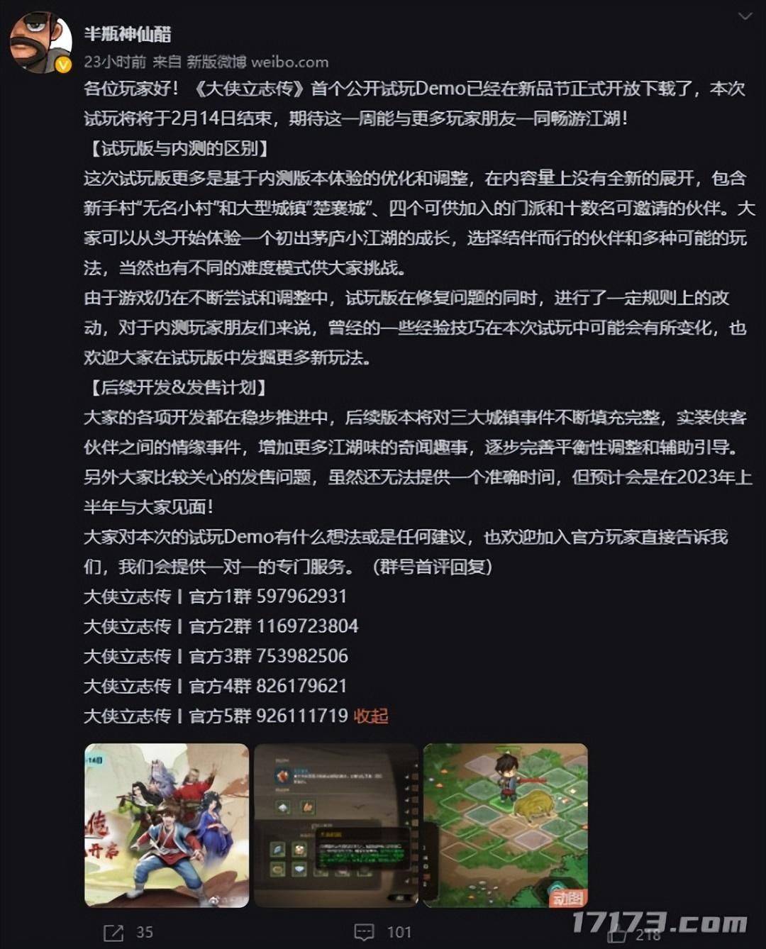 据半瓶神仙醋在微博上发文表示,游戏预计将会在2023年上半年正式与玩家见面,感兴趣的玩家不妨提前体验一下。