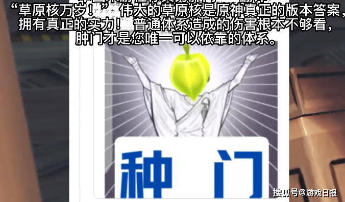 先来说说最近原神国服大火的“种门”。种门其实就是草系反应,由于绽放等反应会产生草原核,草原核的伤害和视觉效果都非常爆炸,加上非常契合深渊的环境,于是一众玩家纷纷转入“种门”,练起了草系配队。这一围绕草系反应展开的“种门”狂欢也在不久前传到了日本论坛,许多海外朋友了解过后纷纷表示涨知识了,并且毅然决然加入“种门”,为“种门”绘制了许多梗图,还非常后悔没抽“种门”主C艾尔海森。