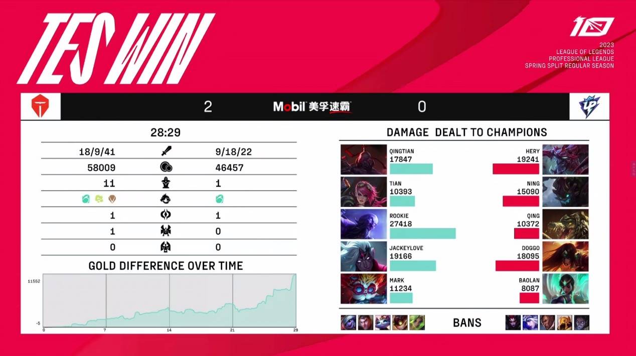 LPL在今天七点档进行的是IG仁川内战的比赛,Rookie+JKL所在的TES大战Ning宝蓝所在的UP,结果TES是成功直落两盘拿下比赛胜利。