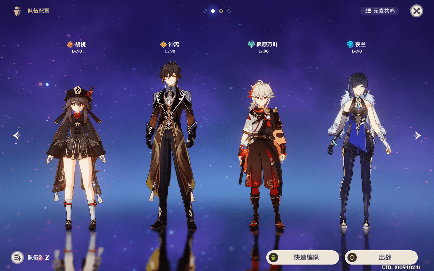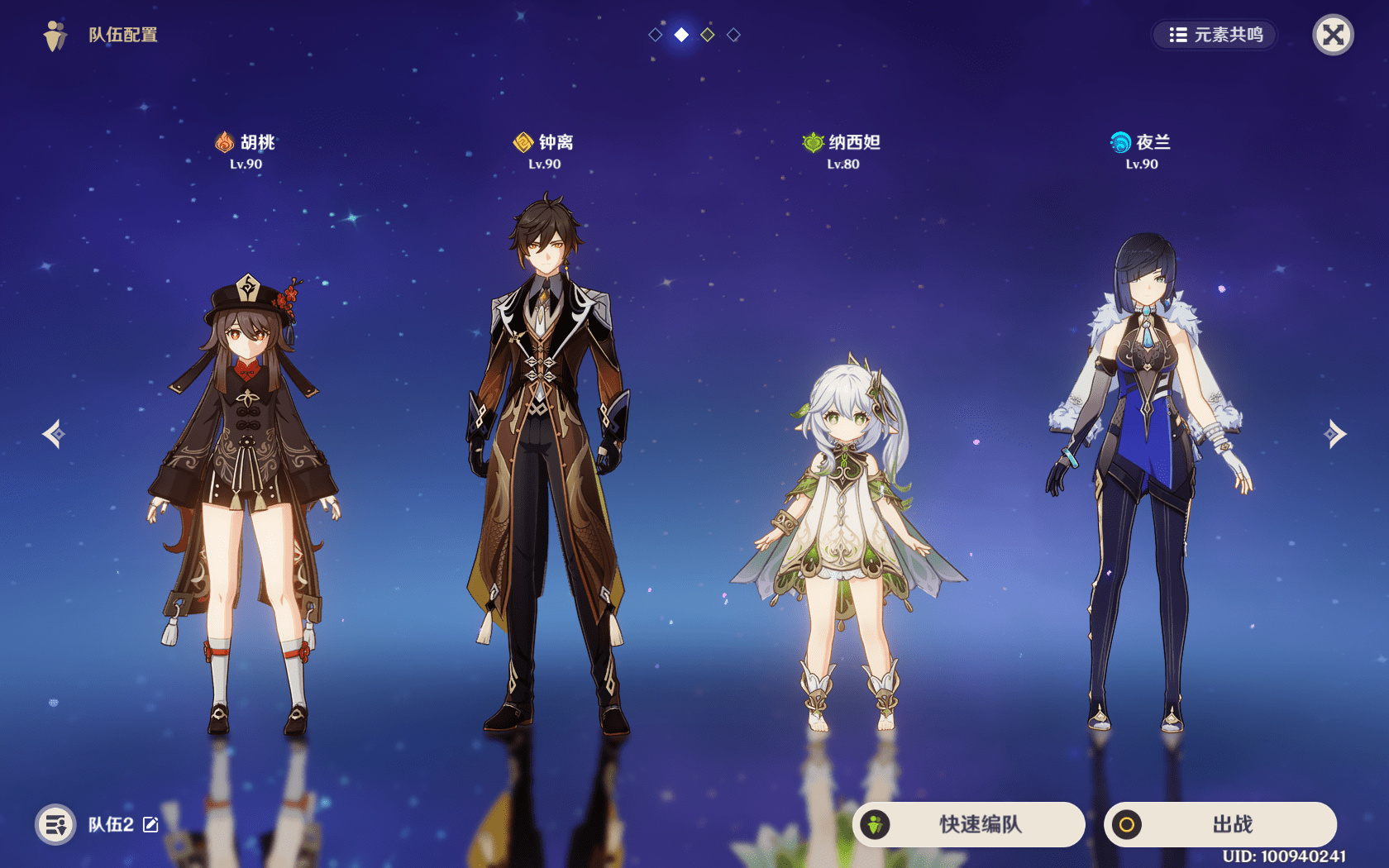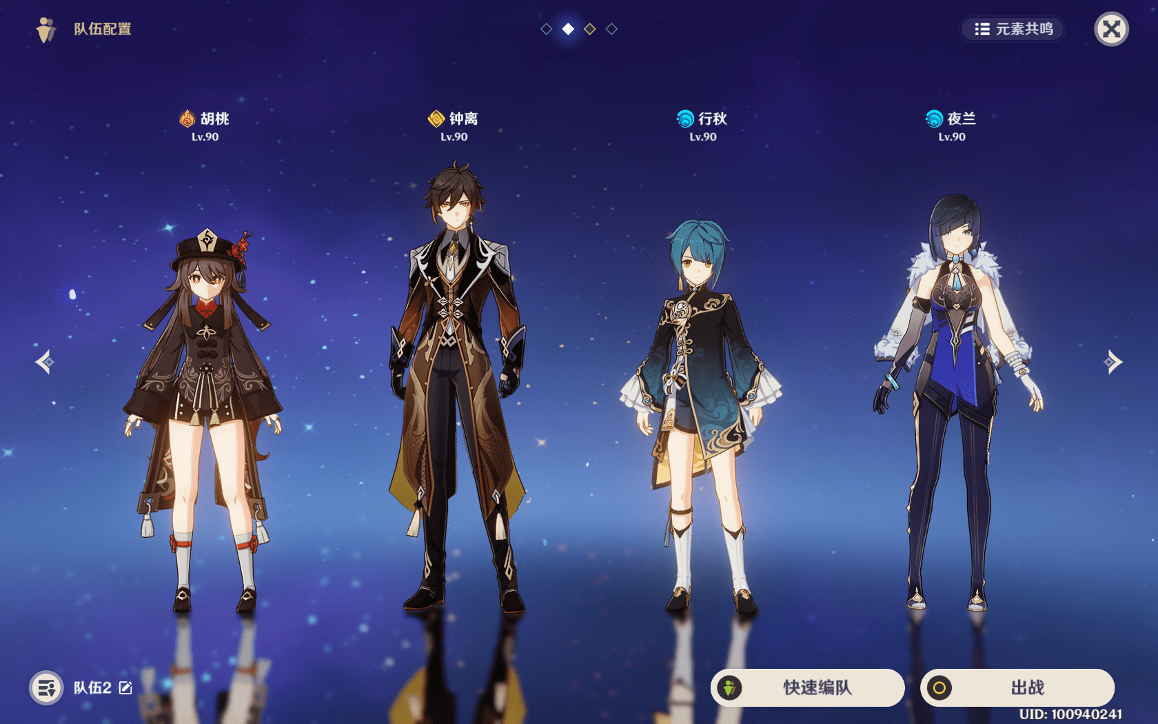 队伍搭配1:胡桃+钟离+行秋+夜兰。