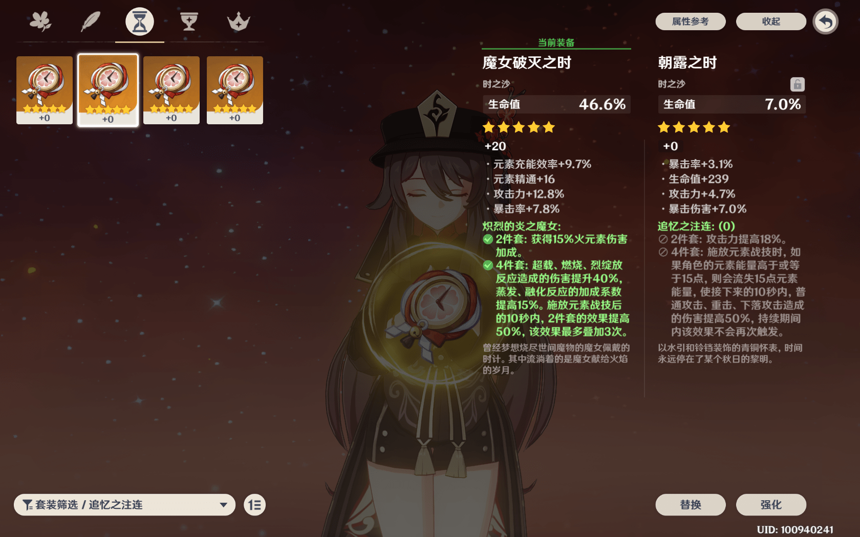 圣遗物套装:魔女4件套最佳,适用性最广,至于追忆4件套一直有争论,适用场合有所不同,但论输出上限还是要魔女,元素反应伤害的加成系数可是很高的,另外饰金4件套也能用,但只能作为过渡。