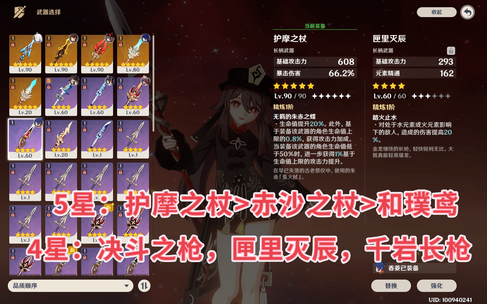 5星武器推荐:护摩之杖>赤沙之杖>和璞鸢。护摩专武不用说了,赤沙之杖是赛诺专武,但对于打蒸发的胡桃同样适用,同时有加暴击率还是不错的,和璞鸢是老选手了,对于歪出来的玩家来说选它比较省事。