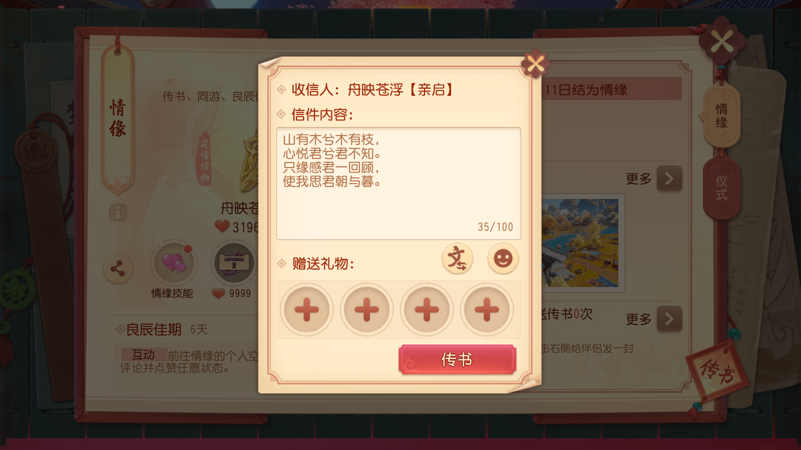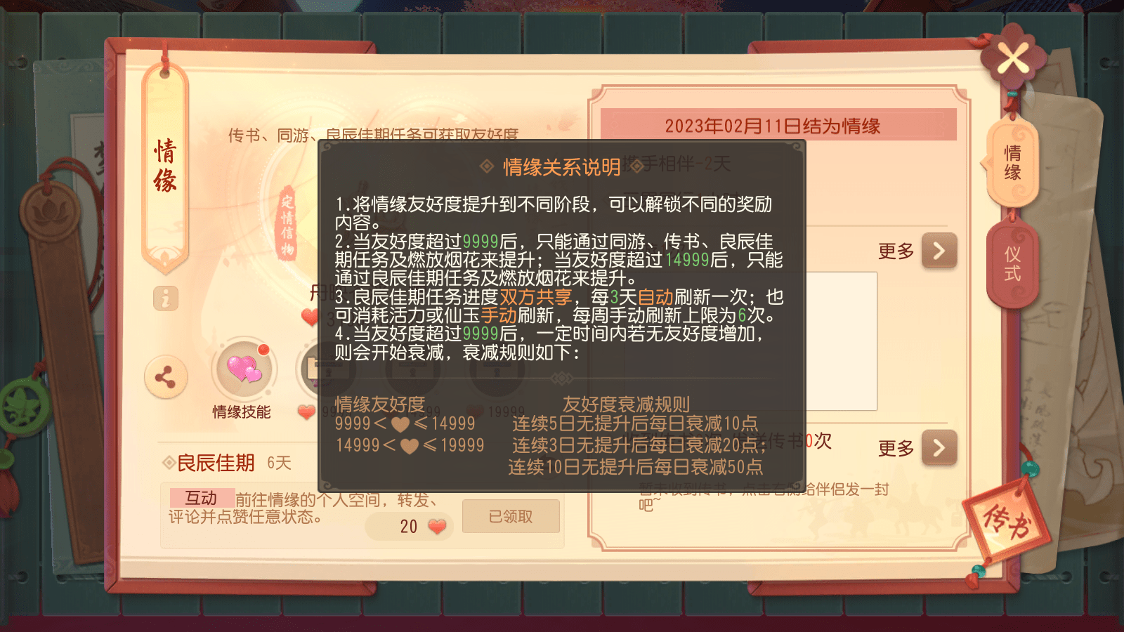 书信传情,佳期如许。每次消耗50点活力给情缘寄送书信,每日前两次【传书】共可加20点友好度。【传书】时还可附赠限定外观,随信赠送的礼物不影响友好度变化。