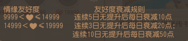 当14999<友好度≤19999时,连续3日无提升,第4日开始友好度每日衰减20点;连续10日无提升,第11日开始友好度每日衰减50点。