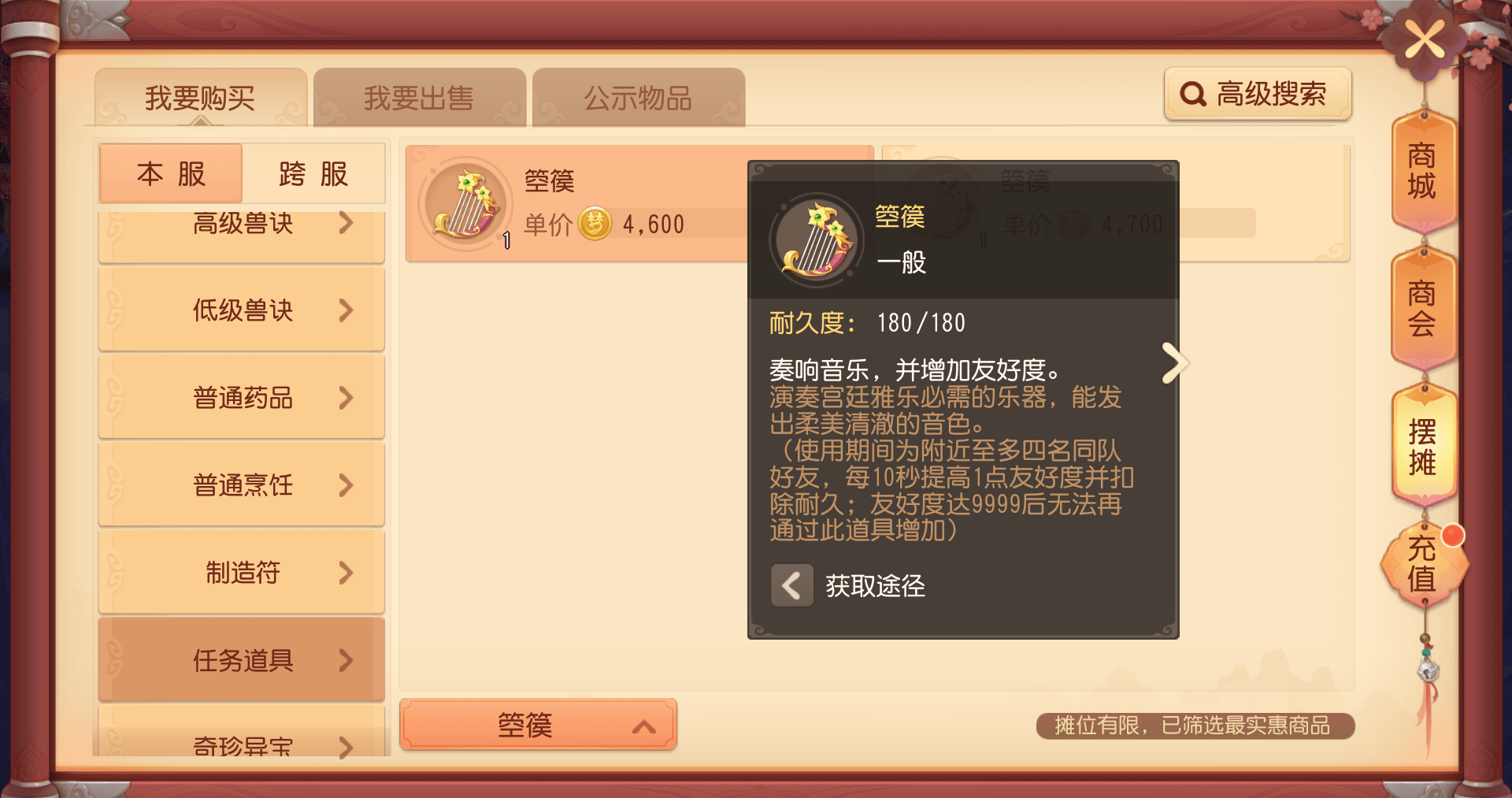 组队模式下,使用乐器【编钟】或【箜篌】,即可队伍五人互相增加好感。乐器也可以在【商城】购买,使用时每10秒提高1点友好度并消耗7点耐久。