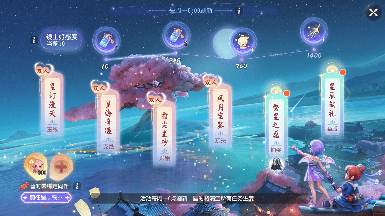 在【星辰幻梦】活动中,使用道具【星辰之约】绑定同游者,每周完成任务积累49点进度,即可在周一0点位面副本刷新结算时获得99点友好度,并获得1颗星。积攒14颗星后可获得永久定制称谓【同游者名字】的星辰伴侣。