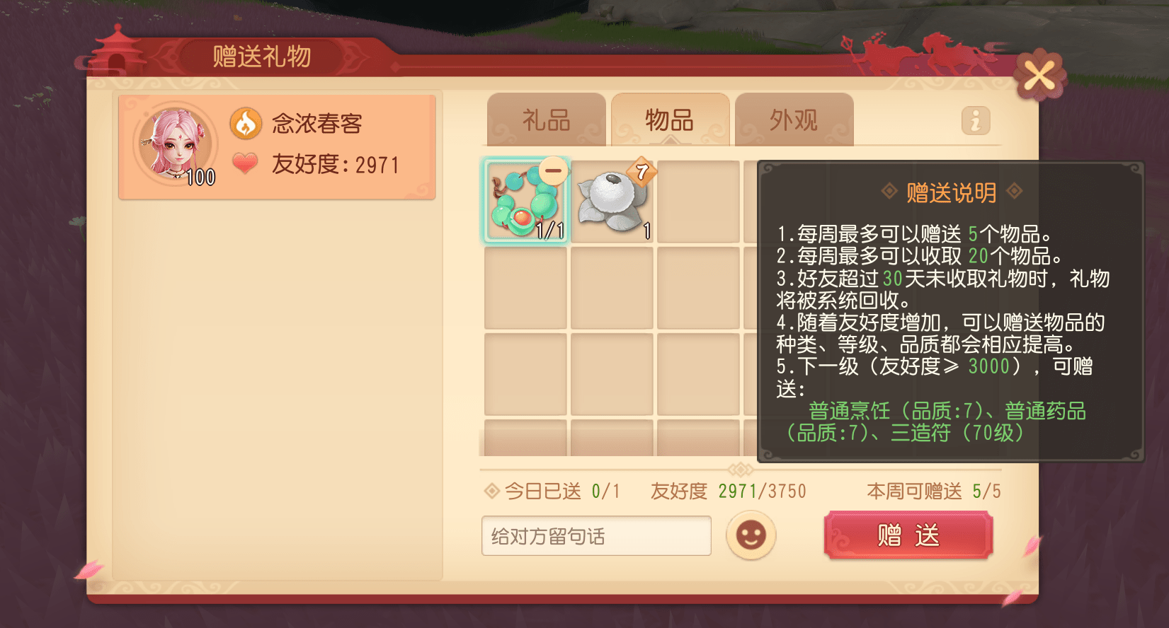 赠送普通道具也可增加友好度,不同阶段友好度能赠送不同种类、等级、品质的物品。好感度满3000即可赠送70级三造符、7品药物和烹饪,每周每人可以送出5个物品,收取20个物品。