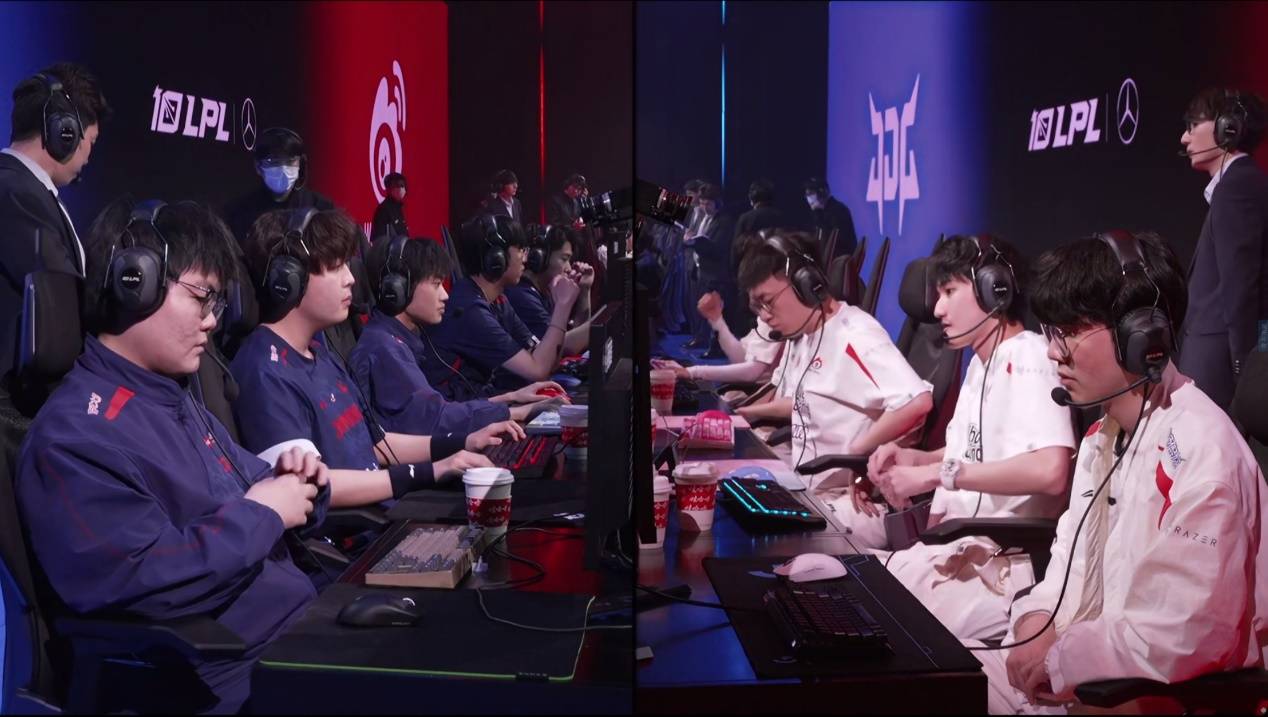 双方中期开始换防御塔资源,JDG是三条龙听牌,小虎瑞兹是多人开车抓到了单带的Knight成功完成击杀。