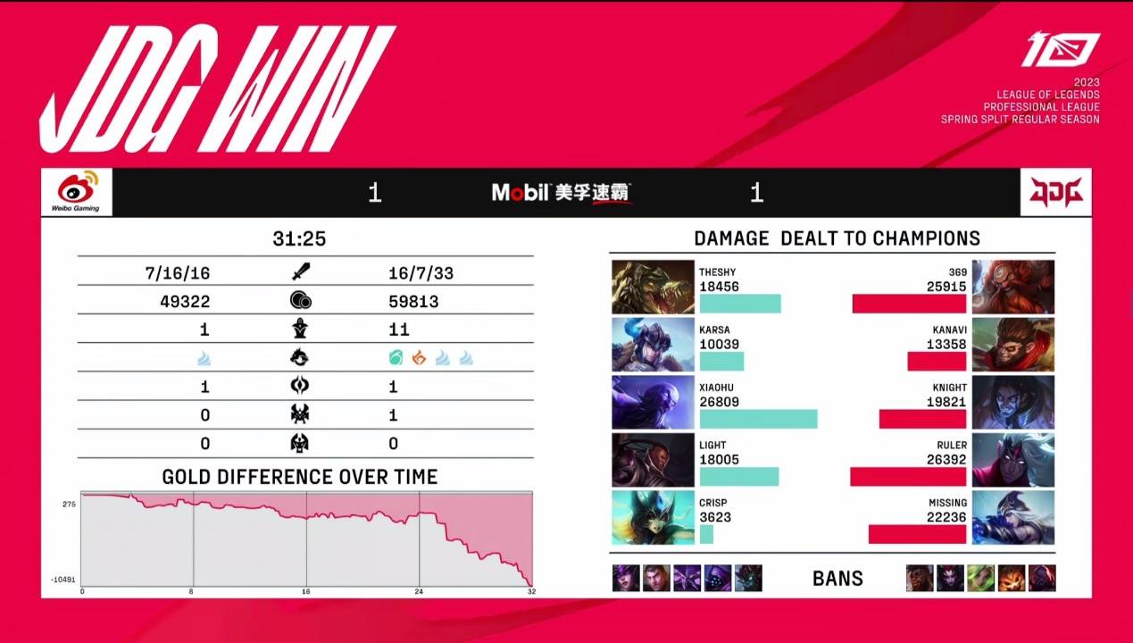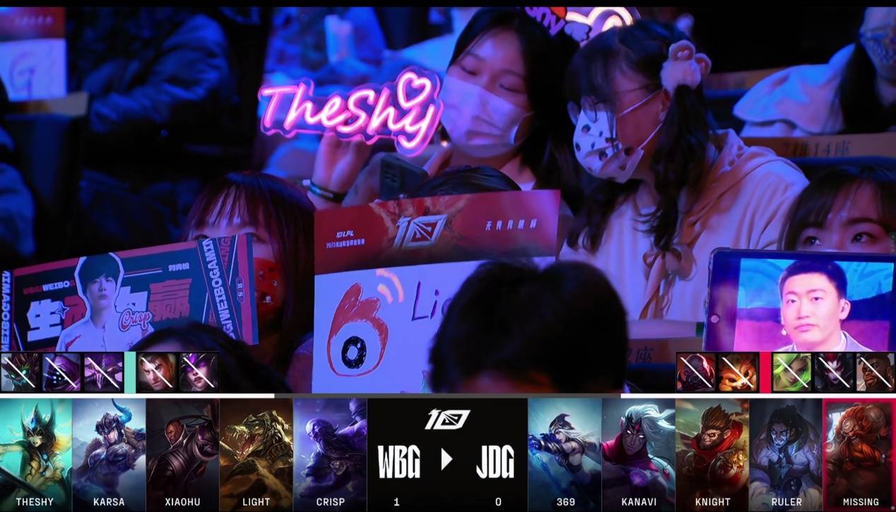WBG与JDG的巅峰对决,第一局WBG顺利取胜的情况下,JDG在第二局拿下辅助艾希,本局比赛成为369的个人秀场,对线期连续两次单杀The Shy,直接打崩上路。