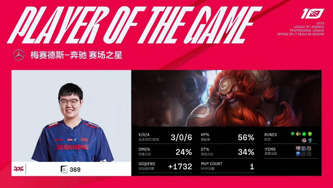 然后JDG方面,表现最好的应该是369,这手酒桶从之前被Karsa吐槽,到现在已经致臻化境,直接暴打了Karsa的上单。