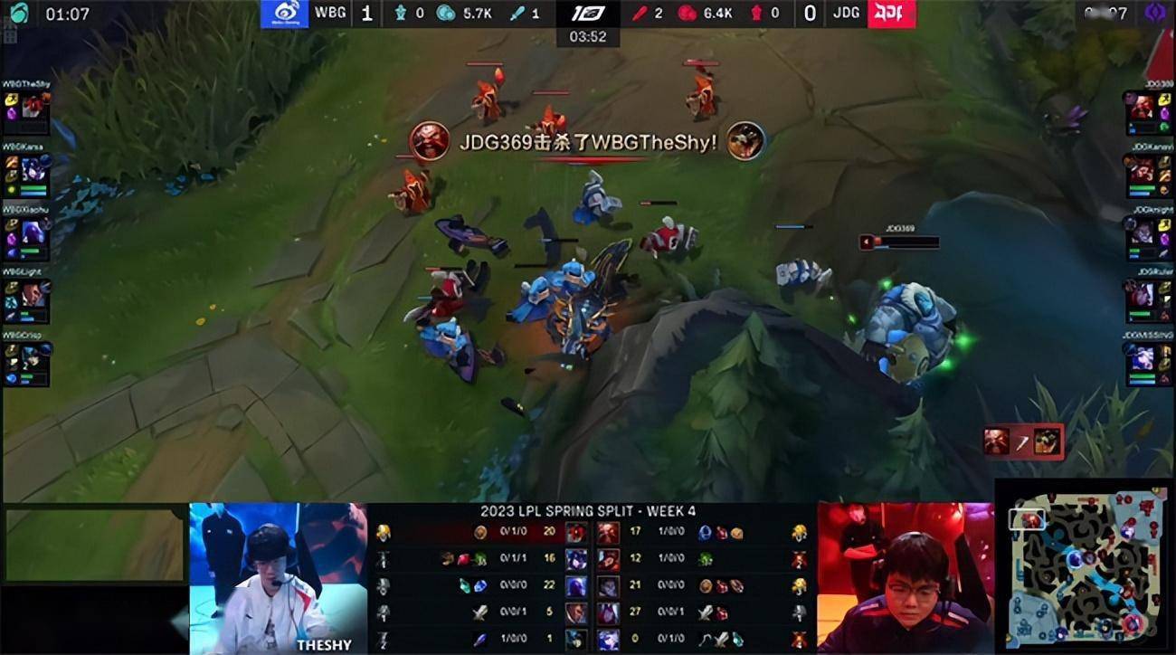 蜘蛛趁机控下风龙进行止损,作为交换猪妹拿到了峡谷先锋。剑魔把赛恩打成半血,猪妹再次抓上得手,帮剑魔越塔强杀了赛恩,并且放出先锋撞掉WBG上一塔的镀层。蜘蛛见状继续gank下路,卡尔玛卖自己保下了韦鲁斯。11分钟JDG上、中两开花:TheShy的剑魔第三次被JDG上野抓死,猪妹马不停蹄赶往中路,knight的阿卡丽操作拉满,双方中野二打二的结果是JDG打出一波0换2。蜘蛛复活后控下炼金小龙,泽丽单吃了下路一血塔作为止损。JDG则抱团拿到了第二只先锋,很快推掉WBG上、下路一塔。