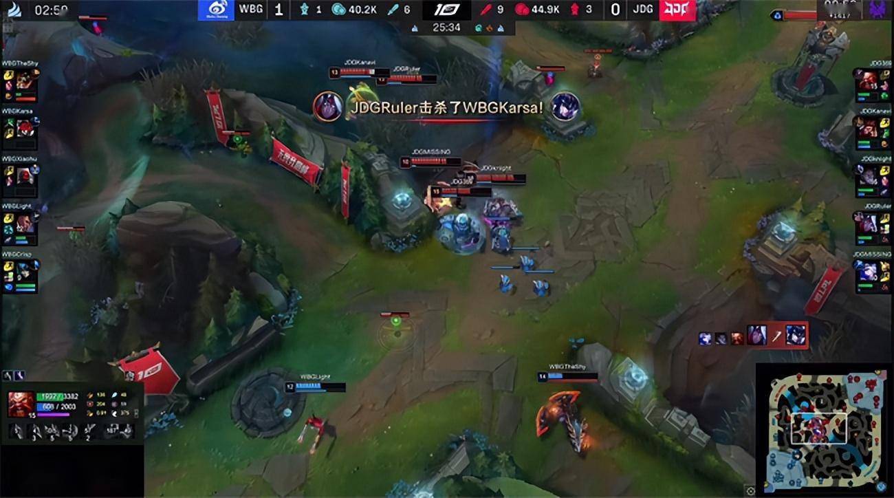 Karsa的蔚也不甘示弱,摸进JDG的蓝buff野区,埋伏在JDG中一塔左侧墙后,等辛德拉把兵线推进塔内,先手Q穿墙击中阿卡丽,辛德拉再跟大招将其带走。猴子等WBG众人回城,控下水龙进行止损,随后双方在峡谷先锋河道展开拉扯,JDG先发制人击杀了蔚,绕后而至的泽丽开大融化掉辛德拉,WBG只能放掉先锋。369的鳄鱼又在上路越塔单杀了TheShy的赛恩,JDG的前期节奏起飞。14分钟辛德拉游走到上路,帮赛恩抓死了鳄鱼。泽丽趁机单吃了下路一血塔,作为交换WBG拆了中路一塔。