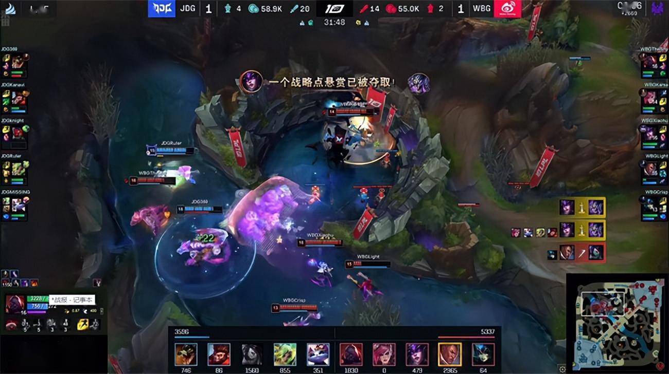 31分钟JDG偷大龙被发现,Light的卢锡安在侧翼单防击杀了阿卡丽,Xiaohu的辛德拉还抢到了大龙!经此一役JDG优势不再,WBG掩护大龙buff兵线推掉中路水晶,集火带走了鳄鱼尝试一波,辛德拉试图闪现秒掉泽丽,猴子反手击飞了辛德拉,JDG打出1换3守住了基地,双方都“听牌”了风龙魂。最终JDG在中路先手开团时没能击杀辛德拉,WBG反打出1换2一波结束比赛,有惊无险2-1终结了JDG的四连胜!