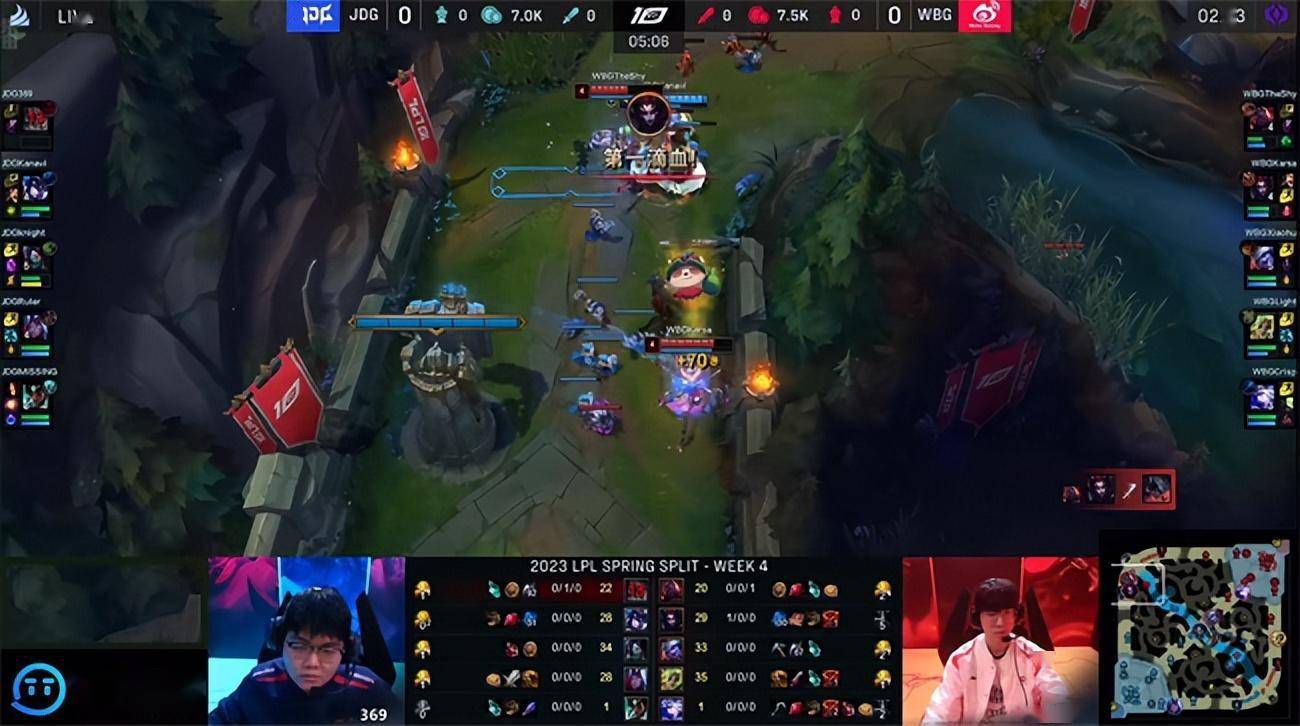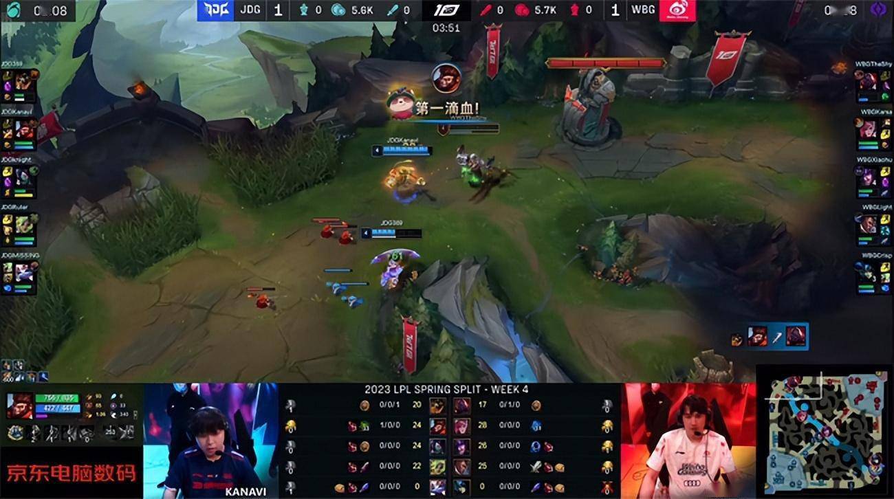 开局WBG只有中路压线,上、下路继续缩塔补兵。Kanavi的猴子刷到4级gank上路,灵性地规避了赛恩插在河道草丛的视野,利用W上大龙坑,绕后包夹逼出赛恩的闪现,JDG上野跟双闪现拿到一血。