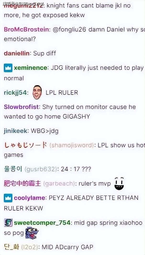 而这场比赛因为有太多明星选手了,所以在海外直播平台的人气也很高,在比赛结束后,海外网友也发弹幕表达了自己的看法。有人表示Knight的粉丝不该再指责JKL了,因为他这场比赛被爆了。也有人表示辅助差距。还有人认为如果JDG正常玩,应该能赢。另外关于Ruler的评论也很多,有人嘲讽说Peyz确实比ruler强,也有人阴阳怪气Ruler才是第三局的MVP。而小虎也收获了海外网友的认可,不少人狂吹这场中路差距,春天的小虎太猛了。