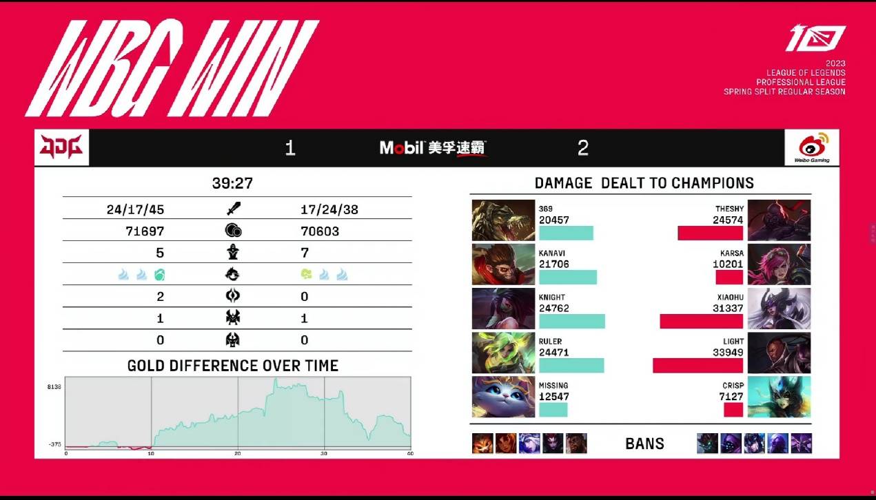 LPL在昨天进行的焦点大战对决中,此前拿下四连胜的JDG,在面对WBG的情况下翻车,被对手以2-1的比分击败,WBG最后一局完成的逆转令人印象深刻。