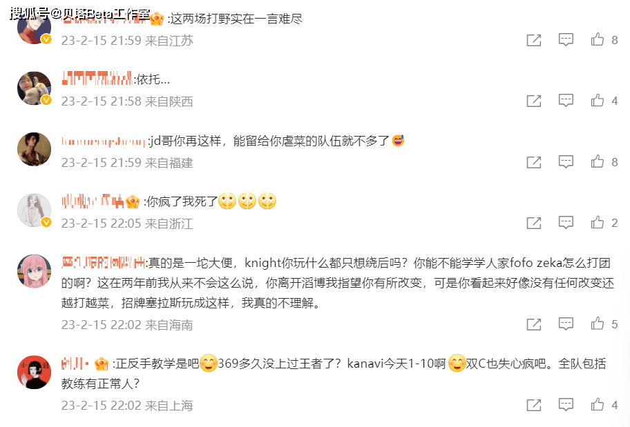 JDG落败后,官博下方的评论如下,首先是很多人直言kanavi这两场打得一言难尽,然后就是不少人怒斥Knight打得太差了,招牌塞拉斯打成这个样子,真的越打越菜了;还有人吐槽369被Ale正反手教育,批评369在Rank不够努力,已经很久没有上过王者了。