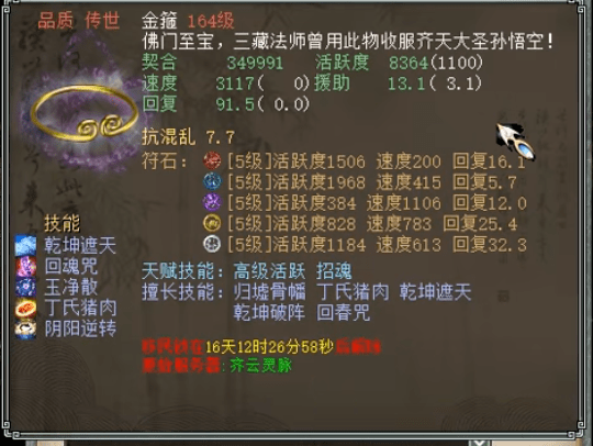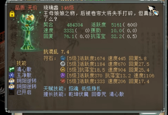 再来看这支队伍中的另外一件灵宝,不知道各位老铁队伍中有没有一件带招魂的灵宝呢?一心见过有不少队伍中,队友带一个招魂的辅助灵宝,这件辅助灵宝的,关键时刻能起到救命的作用,以防队中有人挂掉,影响整体的“战绩”。