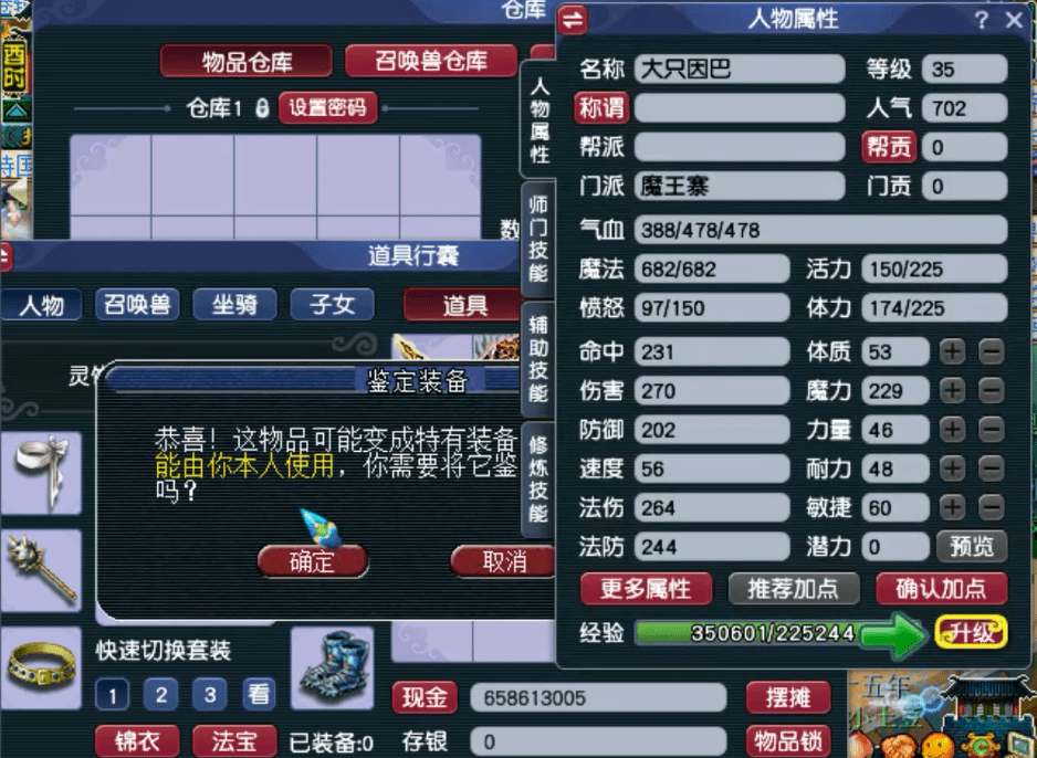 今天的的主角是这个35级的魔王寨角色,一般看到这么低等级的号,我们只有一种感觉,那肯定是出货了,或者老板拿小号来鉴定军火的。毕竟拿高等级的号鉴定军火,万一出了专用无级别,就尴尬了!