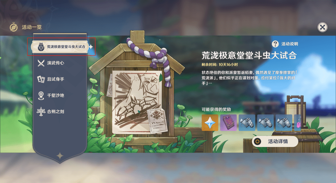 需要先过一段剧情,荒泷一斗玩斗虫被一个小孩打败了,就搭起一个舞台,让旅行者和派蒙暂时加入荒泷派,增强荒泷派的斗虫实力。小孩每天会派一个朋友来这里挑战,旅行者就要靠斗虫将一个又一个小朋友打败。非常轻松具有童趣的活动。