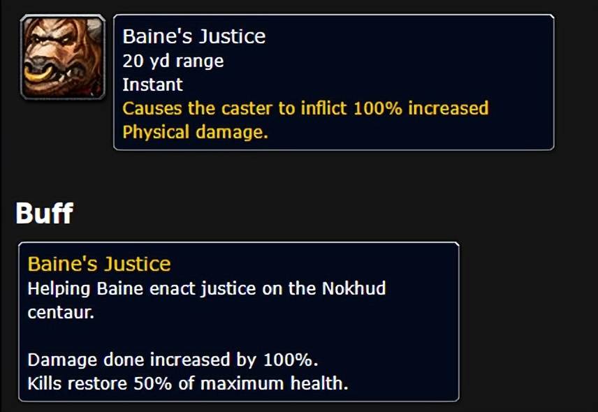 贝恩·血蹄是凯恩·血蹄的儿子,牛头部落的继任领袖,主要功绩是抵御了当地半人马的侵扰。在PTR中,玩家发现了一个名为“Baine's Justice”(贝恩的公正)的增益Buff,涉及一场与马鲁克半人马的战斗,另有一个名为“Baine's Potion of Invisibility”(贝恩的隐形药水)的道具,用于某个潜入任务。另外,一些牛头人主题的头饰、项链、武器、任务物品,以及新的牛头NPC也被发现。