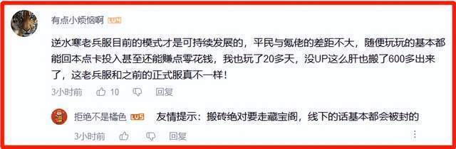 不得不说,《逆水寒》魔兽老兵服这一套组合拳确实打得不错。通过丰富的游戏内容以及良心的运营模式。普通玩家可以享受高质量游戏体验,还能赚外快;土豪玩家则能通过挑战高难度玩法找寻游戏的快乐,而且除了一部分乐意花大钱首通的人之外,其他玩家还能等装备价格下降后再购入,这种玩家互相受益的自由市场氛围也真的很少见了。