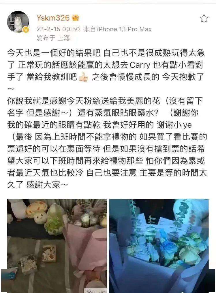 YSKM发文说道:今天也是一个好的结果吧自己也不是很成熟玩得太急了正常玩的话应该能赢的太想去Carry也有点小看对手了当给我教训吧之后会慢慢成长的今天抱歉了~你说我就是感谢今天粉丝送给我美丽的花(没有留下名字但是感谢~)还有蒸气眼贴眼药水?(谢谢你我的确最近的眼睛有点乾我会好好用的谢谢小ye)。
