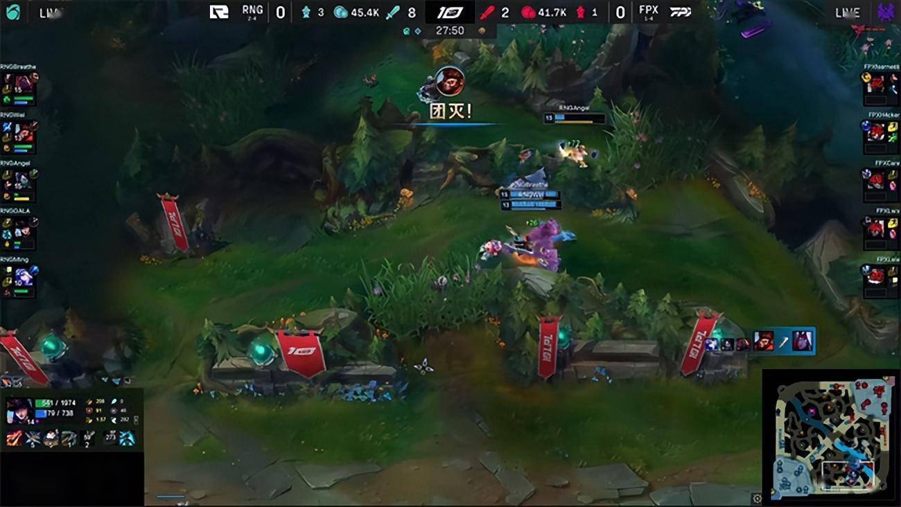 小龙再次引来双方在河道展开激烈拉扯,RNG沉着冷静地优先消耗FPX的前排,赛恩吸收了充足的伤害以后回城补血再TP赶回战场,直接开大撞进人群里,阿卡丽和猴子终于再次找到机会进场,阿卡丽一套完美连招收割战局带领RNG团灭FPX,先后拿到了第三条小龙以及大龙Buff!双方瞬间拉开了7千块的经济差距,RNG回城休整以后带着兵线从上中同时展开推进,拆掉中路高地塔的瞬间艾希大招先手命中韦鲁斯,RNG强势开团打出1换3击溃FPX结束了比赛,先拔头筹1-0领先对手!