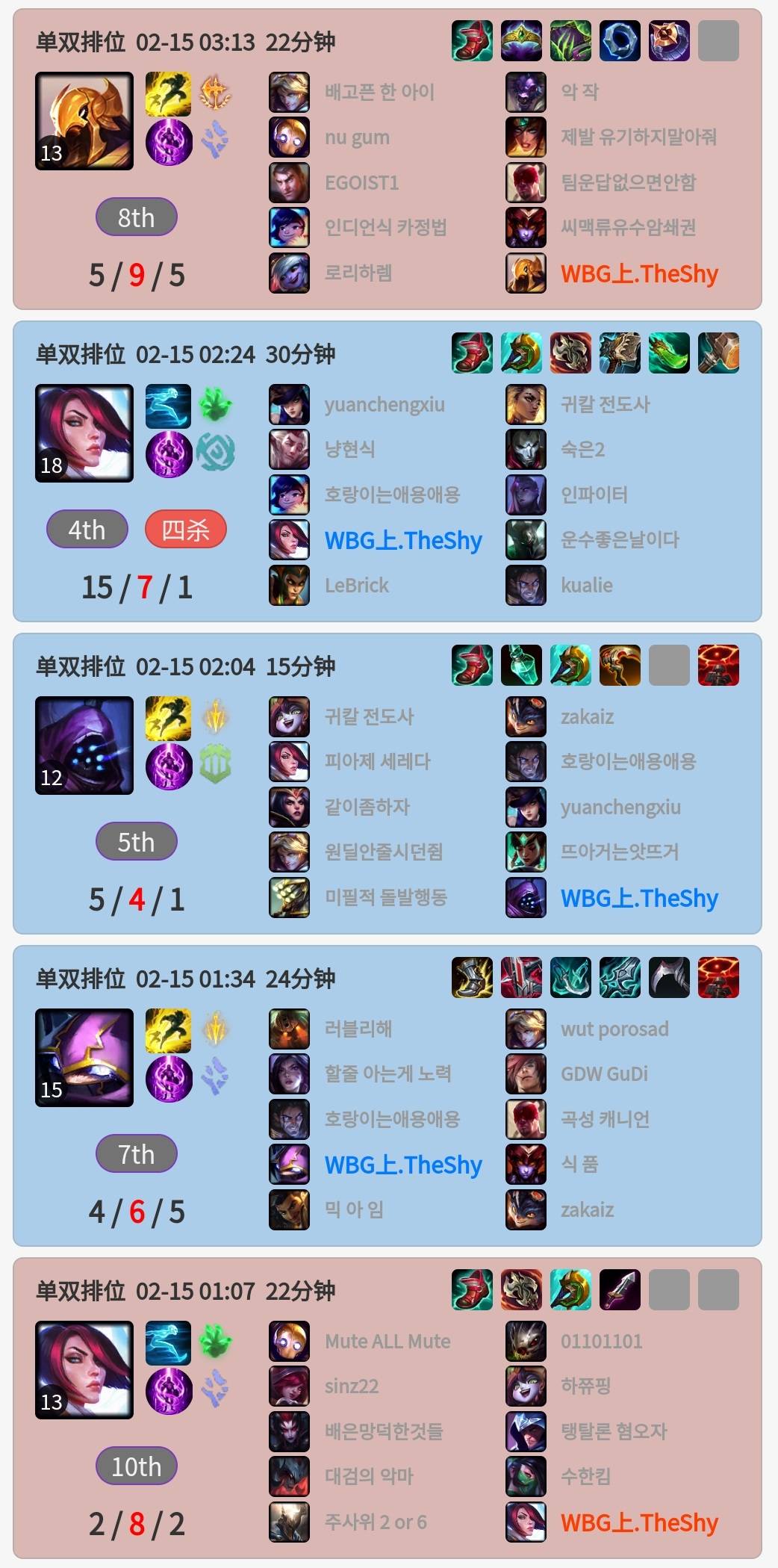 第五局是打了一局沙皇,战绩5-9,五局比赛赢下三局,目前未顶级,从这个战绩表现其实也能看得出The Shy最近的问题所在。