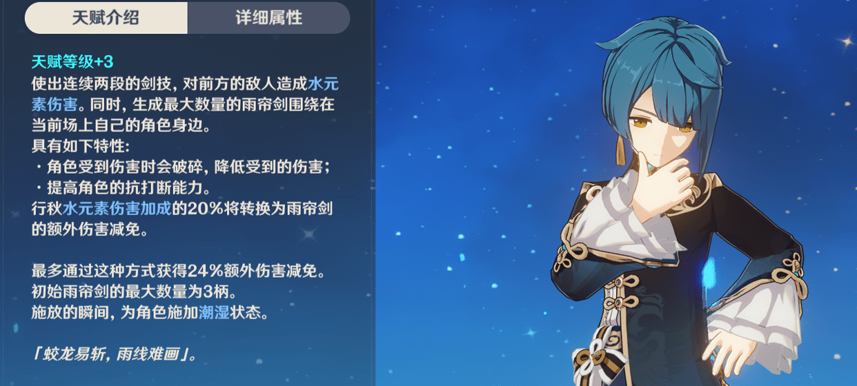 行秋20%水元素伤害加成会转化为雨帘剑的额外免伤(最多24%)