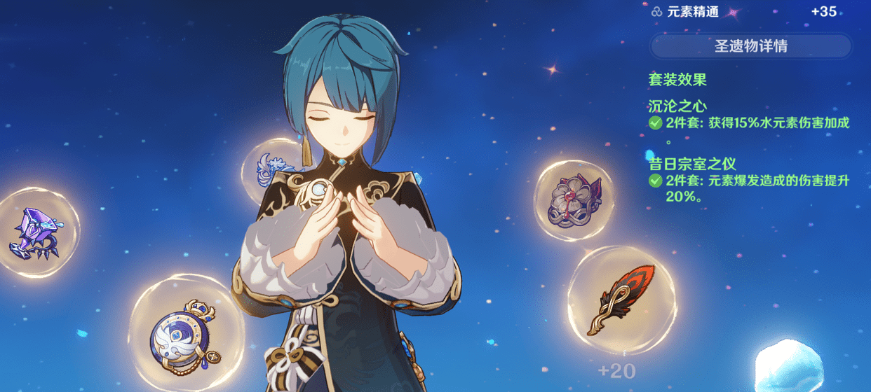 圣遗物的选择不管宗室还是绝缘都可,也比较推荐选择宗室和沉沦的二加二,水元素伤害加成对行秋来讲还是很香的,如果你要选择四宗室的话要注意一点,宗室效果是不叠加的,你队伍里有一套宗室就够了。