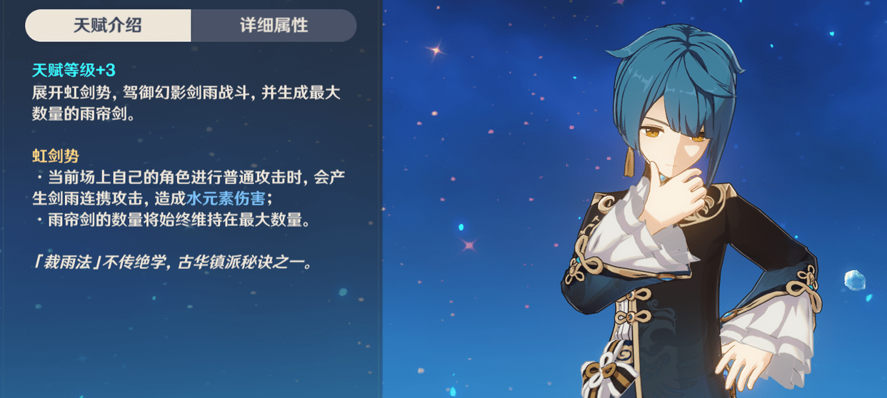 元素爆发“裁雨留虹”就是后台挂水的关键了,开大后当前场上角色普通攻击时,会产生剑雨连携攻击,造成水元素伤害,雨帘剑数量会始终维持在最大数量(初始最大数量为3)。这里需要注意的有两点: