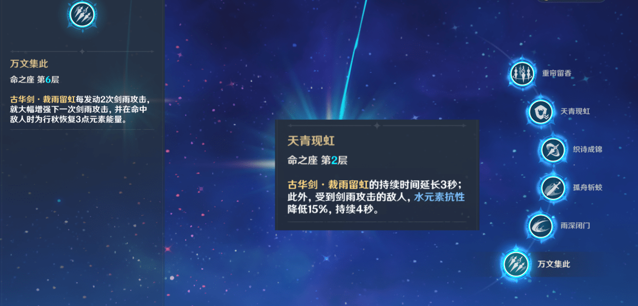 但肯定也没人嫌弃命座多,直接说重点,关键命座在二六,二命延长了大招三秒的持续时间,还会降低敌人15%水元素抗性,整体可以让大招伤害有个不错的效提升;六命则是更进一步,每两次剑雨后会大幅度强化下一次剑雨攻击,并在命中时恢复行秋3点元素能量,增加伤害的同时缓解充能压力。