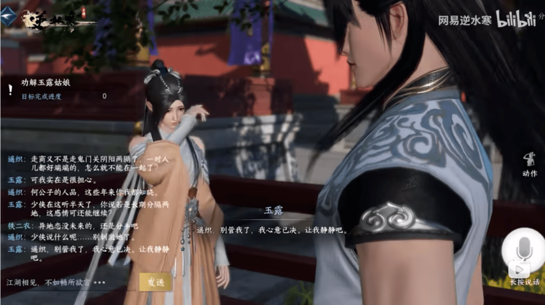 这其实也抛出了一个难题:玩家输入对话内容后,NPC的反馈不单单是ChatGPT那样用文字回复,还需要配上表情、情绪、动作、语音等等……从结果来看,除了语音不太完美以外,视频中NPC整体的形体动作演绎还过得去。比如,在「劝解雨露姑娘」剧情任务中,玩家选择劝分异地恋而不是劝和,结果搞得雨露一边擦拭着眼泪一边去找静静了。