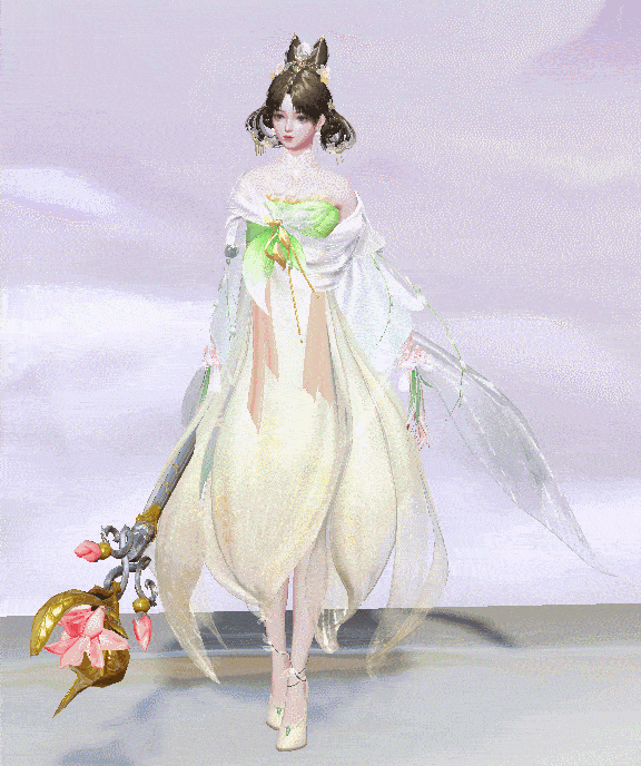 少女用宝钿挽起乌发,以珠片压制的桃花装点发髻,两侧金饰垂落,一步一摇。项间蕾丝缀上白玉,衬一身粉黄色抹胸长裙,显得更加清丽动人。月白与翠绿色的织纱半裹双肩,腕间系上宫粉桃花,飘然欲仙。裙摆裁剪成含苞待放的玉兰花瓣,遮掩住花蔓缠绕的修长双腿,春风拂过裙间余留阵阵花香。