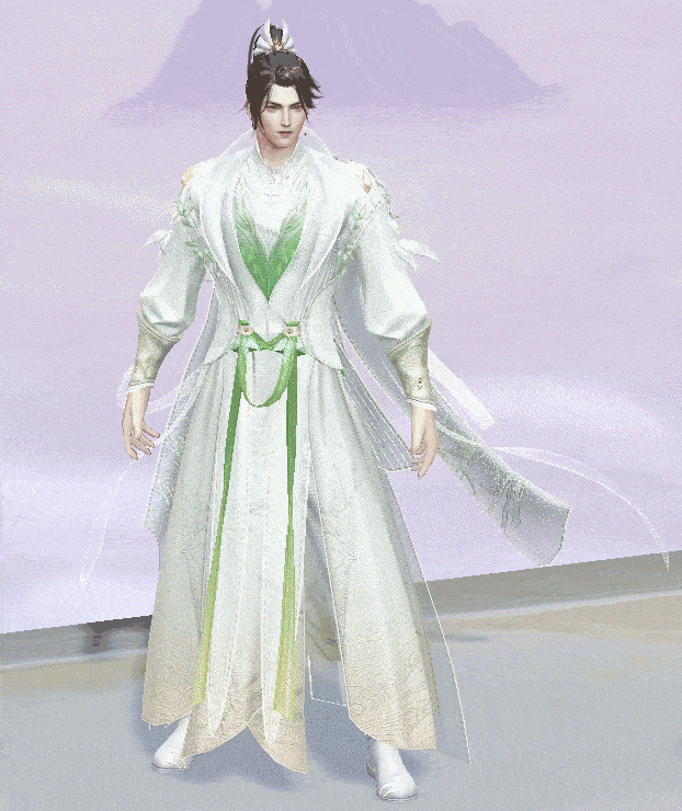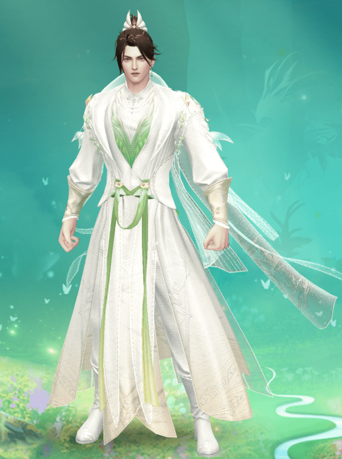 少侠以玉冠高束长发,额前刘海随意拨至两鬓,彰显着随性洒脱。身穿一袭盘扣领浅葱绿长袍,内衬以柳叶纹作衣襟,外着一件绣满翠柳的薄纱,腰间的青绿腰带勾勒出矫健身姿,如细长柳枝于风中飘摇。衣摆处的银丝绘出烟云雨雾,走动时便似踏行在烟波之上。