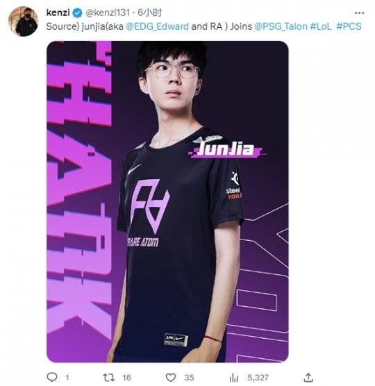 今日一早,韩国记者在推特上爆料了一则消息,EDG打野Junjia,将加入PCS赛区的PSG战队。如果情况属实的话,这位曾经登顶韩服的打野选手,将有望在今年5月的MSI季中赛上,跟LPL队伍交手。