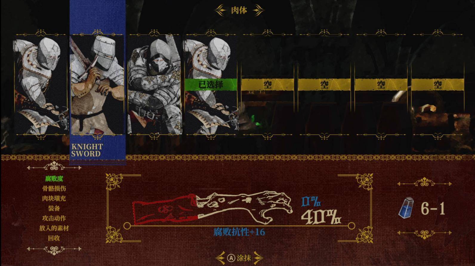 另一个与众不同的设定是,这些躯体都有着一定程度的“腐败度”。你驱使它们闯关,无论胜利与否都会增长腐败度,超过100%即永久死亡。也就是说,每个你制造出来的傀儡都是有使用次数限制的。虽然一些道具可以延缓这个过程,但总体趋势不可挽回,因此如何善用傀儡是一个不得不让人思考的话题。