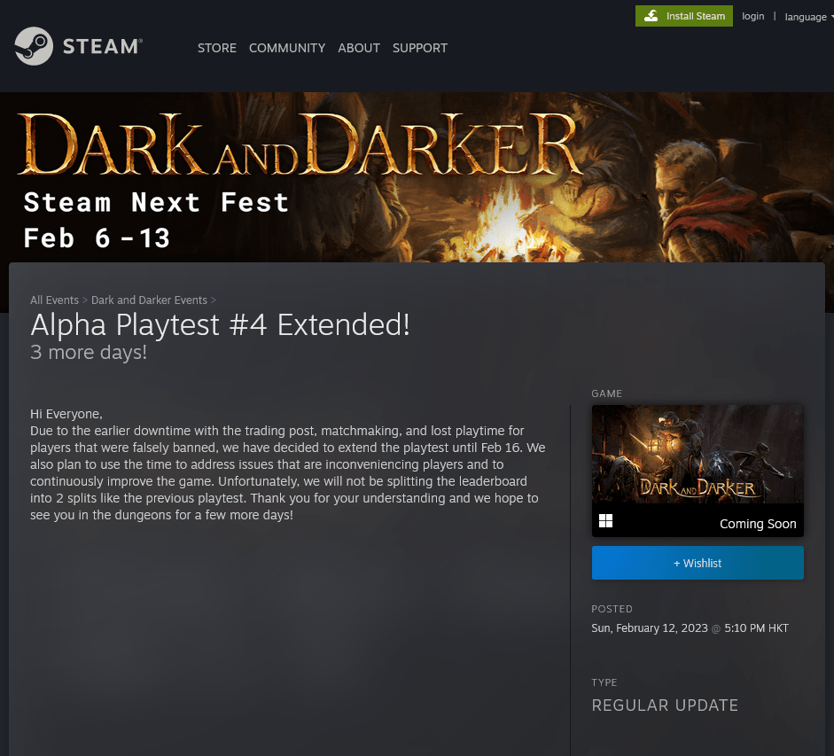 第一人称类塔科夫+地牢探索+大逃杀游戏《Dark and Darker》官方日前宣布,Steam 新品节举办的第四次游戏测试将延长三天,以弥补此前发生的游戏服务器停机时长,以及对可能无辜被封禁的玩家进行补偿。