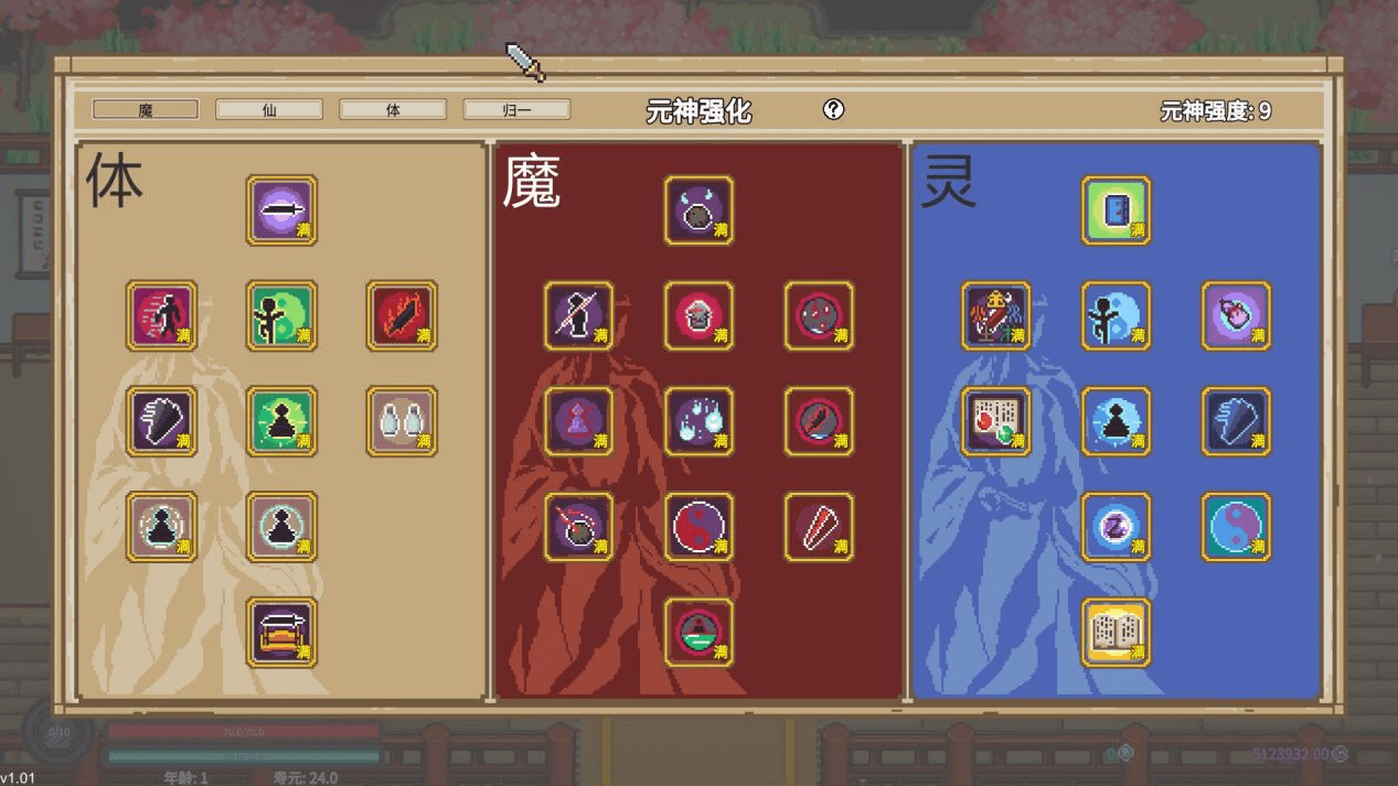 因为《修仙故事轮回》不仅可以修仙,更是可以从体修、魔修、仙修选其一,甚至一气化三清。而每种流派都有着自己的仙途特色。比如魔修,虽然不能扮猪吃老虎双倍突破,却可以无视寿元的限制,用负的命数横扫全图,且越老越强。这让游戏中那些需要支付寿元的鸡肋效果,瞬间变成了香饽饽。