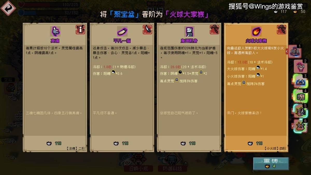 那么在本作内呢?首先在本作玩家的变数比起其他类游戏多了不止一点:升级→进行属性强化(合适或不合适的属性)→根据金钱来换取需要的技能→不断刷新技能寻找自己想要的→再升级...虽然看似在本作内金钱的设定让游戏内的属性和技能构成了一个正循环,但是实际体验后我们会发现这并不是那么简单的事情。